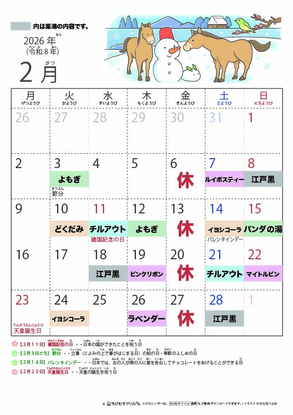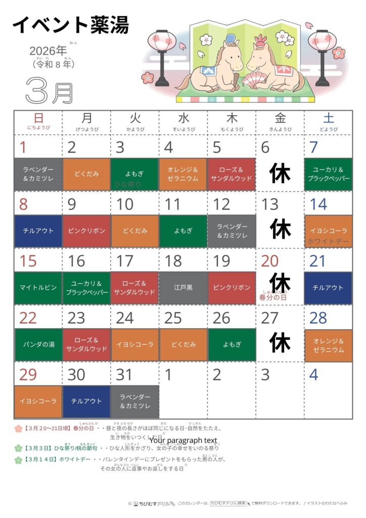 菖蒲湯、桃の葉湯、ゆず湯など季節に応じて様々なお風呂が楽しめます。